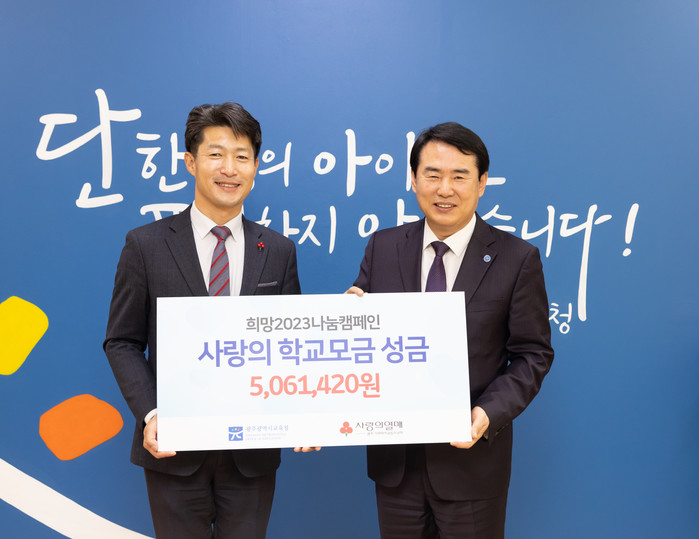 [광주=프레스뉴스] 강래성 기자= 이정선 광주광역시교육감이 16일 교육감실에서 광주사회복지공동모금회에 ‘희망2023 사랑의 학교모금 캠페인’ 모금액을 전달했다.