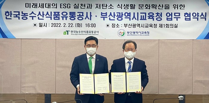한국농수산식품유통공사와 부산광역시교육청(교육감 김석준)은 22일 시 교육청에서 업무협약을 체결하고, ▲저탄소 식생활 캠페인 ‘코리아 그린푸드 데이’ 추진 등 ESG가치 실천 ▲로컬푸드 활용 및 안전한 식재료 공급 등 공공급식 활성화 등에 적극 협력하기로 했다.