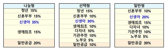 민간 분양의 경우 2세 이하의 자녀가 있는 가구에 생애최초·신혼특공 20%를 선배정한다. 기존에는 우선(50%)·일반(20%)·추첨(30%)으로만 구분이 돼 있었지만 앞으로는 출생우선(15%)·출생일반(5%)을 먼저 공급하고 나머지를 우선(35%)·일반(15%)·추첨(30%)으로 나눈다.