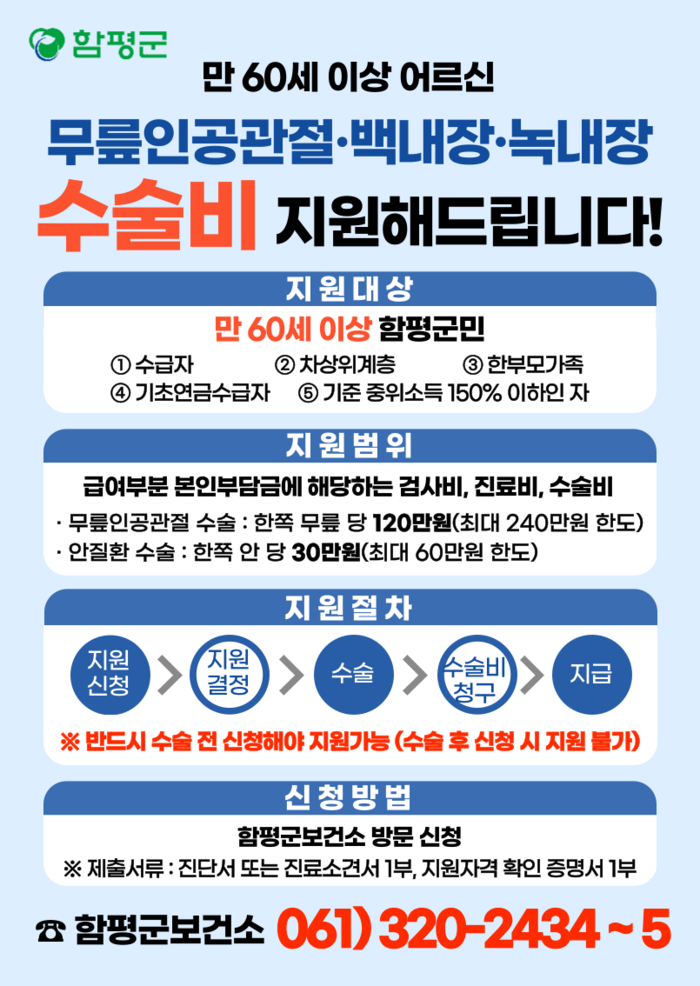 | ▲함평군, 취약계층 노인에 무릎인공관절·안질환 의료비 지원(최종)/함평군 제공 |