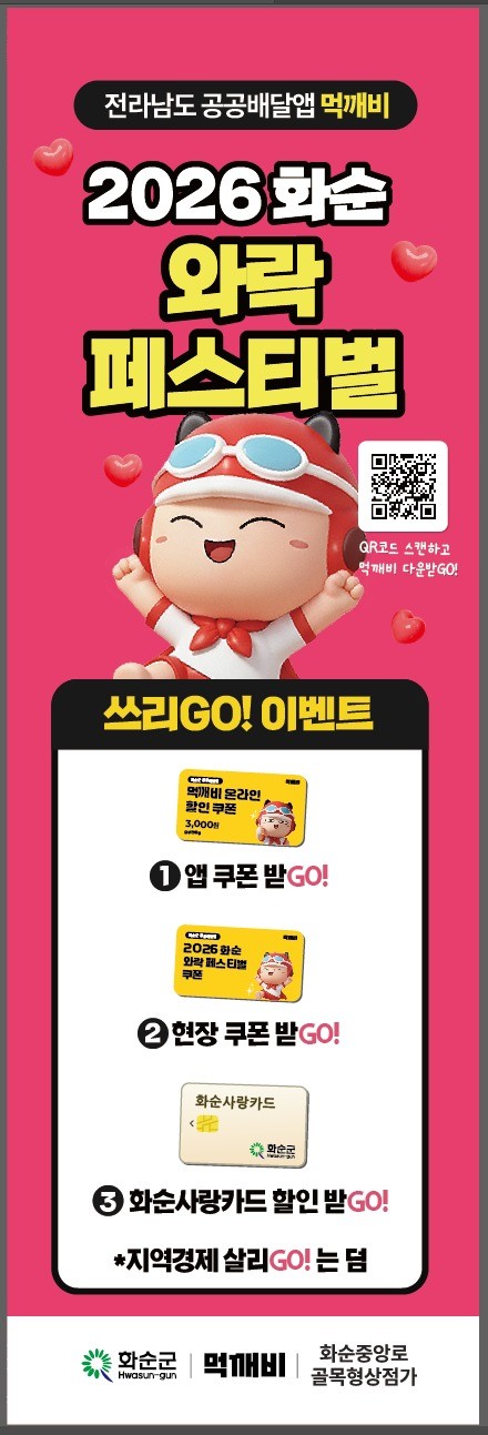 먼저 화순중앙로골목형상점가에서 제공하는 현장 쿠폰은 축제 기간에 광덕문화광장에서 열리는 ‘2026 화순 와락’ 행사장을 방문하면 받을 수 있다. 해당 쿠폰은 먹깨비 앱에서 사용할 수 있는 3천 원 상당의 할인권으로, 양일간 선착순으로 지급된다.