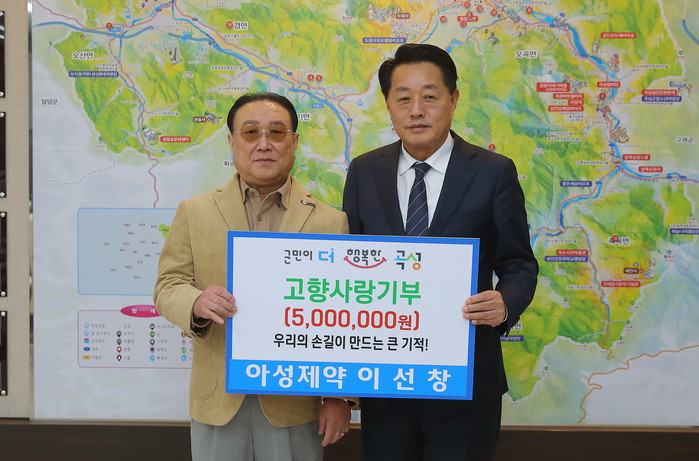 지난 12일, 곡성재광향우 아성제약 이선창 전무이사는 곡성군의 의료서비스 제공에 공감하고 500만 원을 기부했다. 이선창 전무이사는 "곡성군 아이들이 지역 에서 편안하게 치료받을 수 있기를 바라는 마음에서 기부를 결정했다”며, “기부문화의 확산을 통해 더 많은 이들이 이 사업에 참여하기를 희망한다”고 말했다.