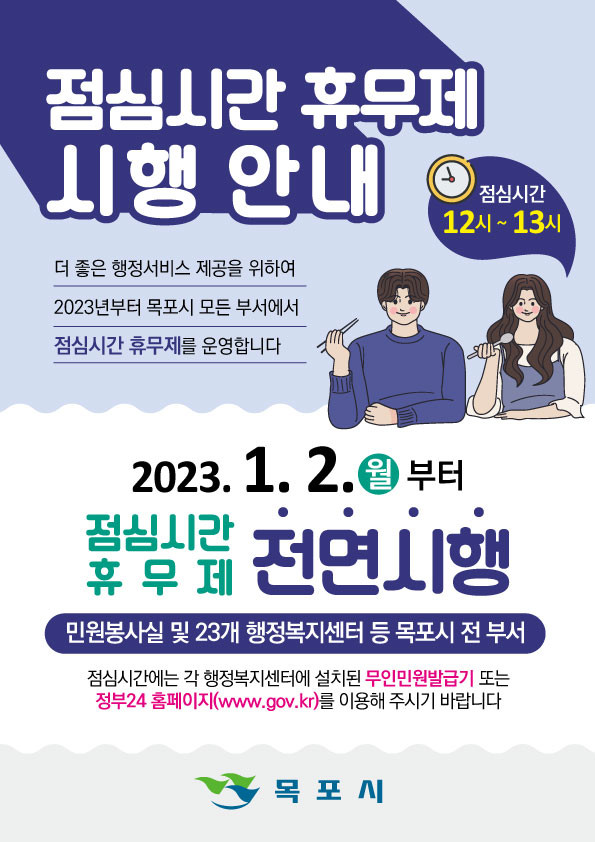 [전남=프레스뉴스] 이광남 기자= 전남 목포시가 오는 2023년 1월 2일부터 ‘점심시간 휴무제’를 전면 시행한다.