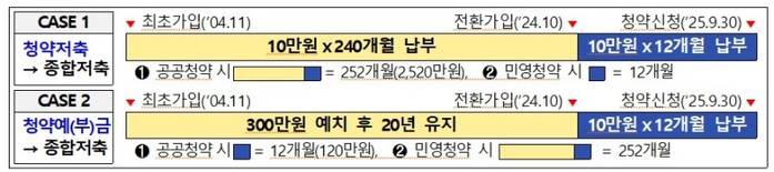 종합저축으로 전환하면 모든 주택 유형에 청약할 수 있고, 종합저축의 높은 금리, 소득공제 혜택, 배우자 통장 보유기간 합산 등 종합저축에서 제공하는 혜택을 받을 수 있게 된다. 다만, 청약저축에서 민영주택으로 전환하는 등 청약 기회가 확대되는 유형은 신규 납입분부터 실적을 인정한다.