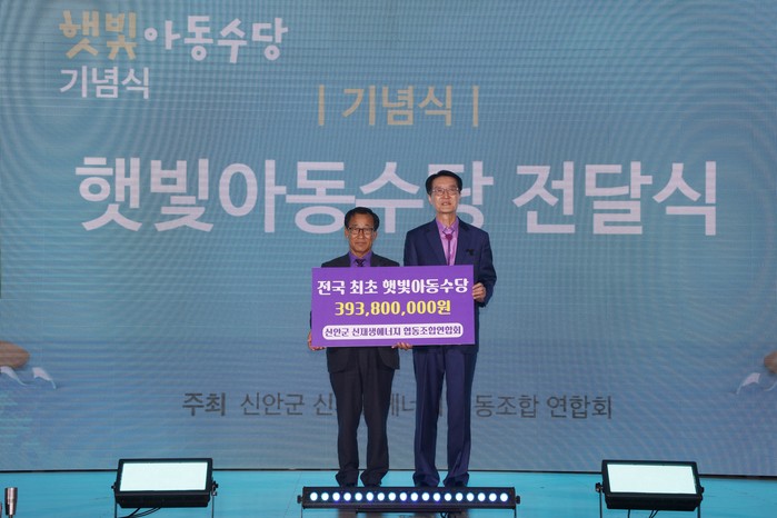 [전남=프레스뉴스] 강래성 기자= 신안군은 제101회 어린이날을 맞아 5월 3일 신안군민체육관(신안군 압해읍)에서 신안군 신재생에너지 협동조합 연합회(이하‘연합회’) 주관으로, 전국 최초로 신재생에너지 햇빛연금을 활용하여 ‘햇빛아동수당’을 지급하는 뜻깊은 기념식이 개최되었다.
