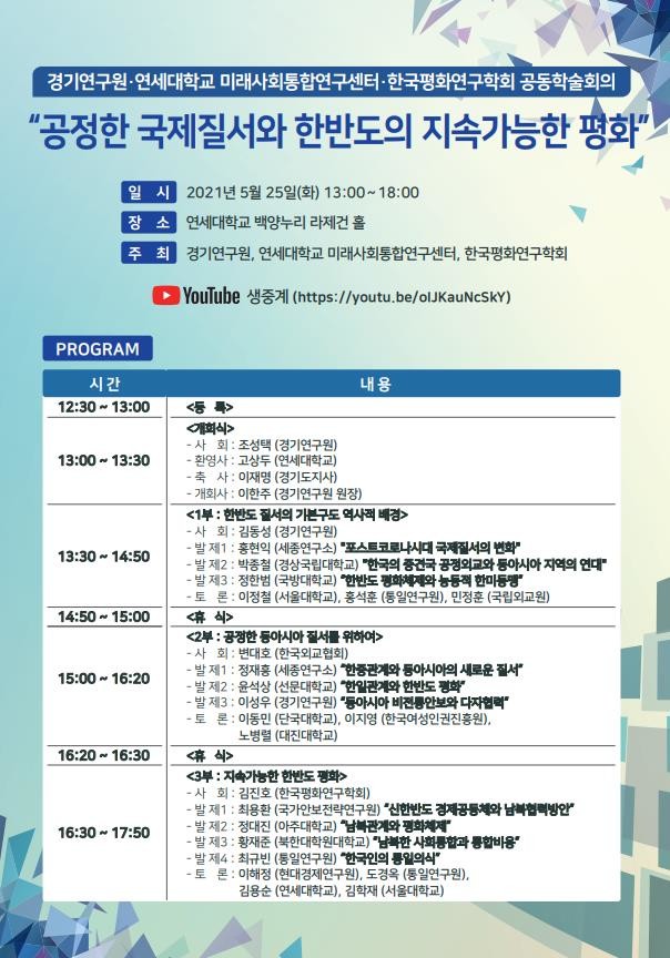 이어 2부(공정한 동아시아 질서를 위하여), 3부(지속가능한 한반도 평화) 세부 주제를 통해 7개의 주제발표가 더해져 동아시아 질서와 한반도 평화에 관한 심도 있는 논의가 펼쳐질 전망이다. 이번 학술회의는 경기연구원 유튜브를 통해 실시간으로 중계한다.