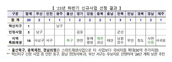 총 49곳이 접수된 가운데 그 중 실현 가능성과 사업 타당성 평가 등을 거쳐 사업목적 달성이 가능할 것으로 판단되는 완성도 높은 사업을 선별해 최종 20곳(혁신지구 1곳, 인정사업 3곳, 지역특화재생 16곳)이 선정됐다.