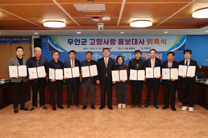 무안군 고향사랑 홍보대사에는 ▲박남철(무안읍 이장협의회장) ▲김용완(일로읍 번영회장), ▲박천규(인의예술회장), ▲주은태(삼향읍 이장협의회장), ▲양근형(삼향읍 번영회사무국장), ▲나덕순(삼향읍 새마을부녀회장) ▲김순기(몽탄중 총동문회장) ▲나종천(청계면 이장협의회장) ▲ 오양길(자유총연맹 현경지회장) ▲김용구(망운면 이장협의회장) ▲구맹모(해제면 번영회장) ▲정회술(운남면 이장협의회장)이 위촉되었으며 임기는 2024년 3월까지이다.