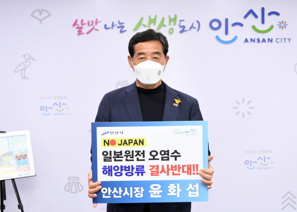 윤 시장은 이날 오전 집무실에서 ‘일본원전 오염수 해양방류 결사반대!!’라고 적힌 팻말을 들고 촬영한 사진을 개인 SNS에 올려 뜻을 같이했다.