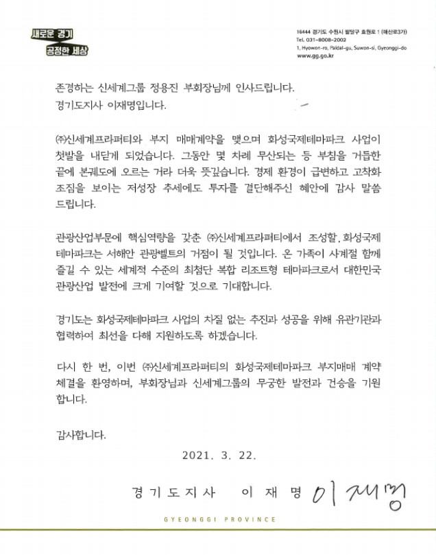 22일 경기도에 따르면 이재명 지사는 이날 정용진 신세계 부회장에게 보낸 편지를 통해 “화성국제테마파크 사업이 그동안 몇 차례 무산되는 등 부침을 거듭한 끝에 본궤도에 오르는 것이라 더욱 뜻깊다. 경제환경이 급변하고 고착화 조짐을 보이는 저성장 추세에도 투자를 결단해 줘 감사하다”고 말했다.