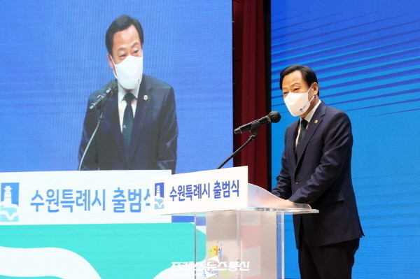 이 자리에서 장현국 의장은 축사를 통해 “천년 경기문화의 심장을 품은 중심도시인 수원시가 특례시로서 새로운 도약을 이루는 날을 맞아 기쁘다”라며 “특례시로서 수원이 새롭게 변모하며 완전히 새로운 미래의 중심도시로 힘찬 도약을 이루기를 바란다”라고 말했다.