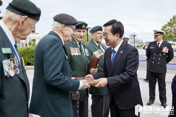 김 지사는 조찬에 이어 전쟁기념비에 헌화한 후 일곱 명의 한국전쟁 등 참전용사를 만나 감사의 뜻을 표하고 선물을 증정했다. 김 지사의 이번 방문에 대해 BC주는 의회 앞 기념비 헌화, 원주민 환영 의식 등 최상의예우를 제공해 눈길을 끌었다. 특히 영국 왕실에서만 제한적으로 사용하는 총독 관저(Government House)에 김 지사를 초대하는 등 국빈급에 준하는 이례적 환대를 베풀었다.