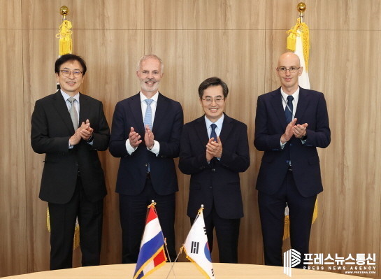 | ▲ 11일 오후 경기도청 도지사 집무실에서 김동연 경기도지사가 폴 베르하겐 ASMI CFO와 김용길 ASMK 회장 등 관계자들을 면담하고 기념촬영을 하고 있다.(왼쪽부터 김용길 ASMK 회장, 폴 베르하겐 ASMI CFO, 김동연 경기도지사, 실비안 헤데 ASMI 사업관리 부문 이사.)사진=경기도 |