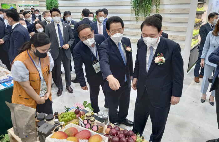 | ▲김영록 전라남도지사가 24일 서울 서초구 aT센터 종합전시컨벤션에서 열린 2022년 창농·귀농 고향사랑 박람회에서윤석열 대통령에게 전남 청년 농업인들이 재배한 농작물에 대해 설명하고 있다./ 전라남도 제공 |