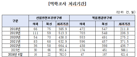 산업안전보건연구원과 직업환경연구원이 각각 수행하는 역학조사 처리기간도 지난해 역대 최대를 기록했다. 노동자가 직업병으로 산재를 신청하면 근로복지공단은 업무와 질병 간 인과관계를 확인하는 재해조사를 하고 필요시 역학조사를 진행한다. 신규‧희귀 직업병 및 대규모 역학조사는 산업안전보건연구원이 수행하고, 일반적인 역학조사는 직업환경연구원이 담당한다.