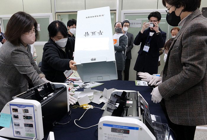 ▲지난해 3월 8일 서울 강서구 강서구선관위에 마련된 제3회 전국동시조합장선거 개표소에서 개표원들이 개표작업을 하고 있다. (사진= 뉴스1) |