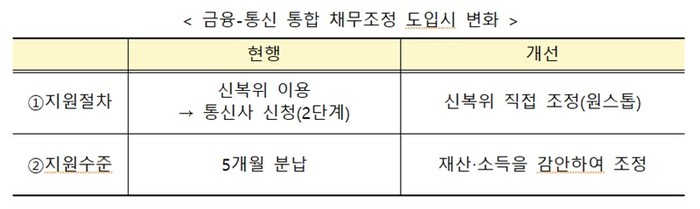통합 채무조정이 시행되면 신복위에서 금융채무와 통신채무를 한번에 조정 받을 수 있다. 또 채무자의 재산과 소득을 감안해 채무자가 성실히 상환하고 재기할 수 있도록 금융채무와 통신 채무가 조정된다.