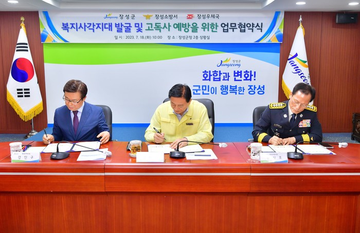 [전남=프레스뉴스] 차윤기 기자= 전남 장성군이 18일 군청 상황실에서 장성소방서, 장성우체국과 업무협약을 체결하고 복지사각지대 해소를 위해 협력하기로 했다.