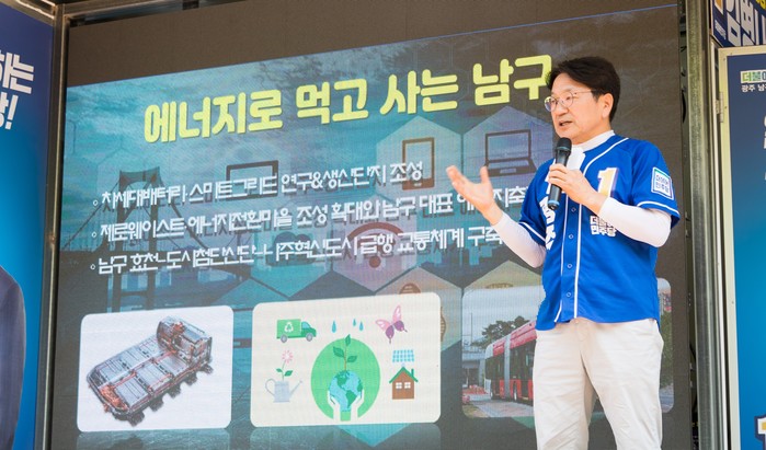또, 에너지 중심도시 남구 발전을 위해 △차세대베터리·스마트그리드 연구·생산단지 조성 △제로웨이스트·에너지전환마을 조성 확대와 남구 대표 에너지 축제 추진 △남구 효천-도시첨단산단-광주·전남공동혁신도시 급행 교통체계 구축 등도 이야기 했다.
