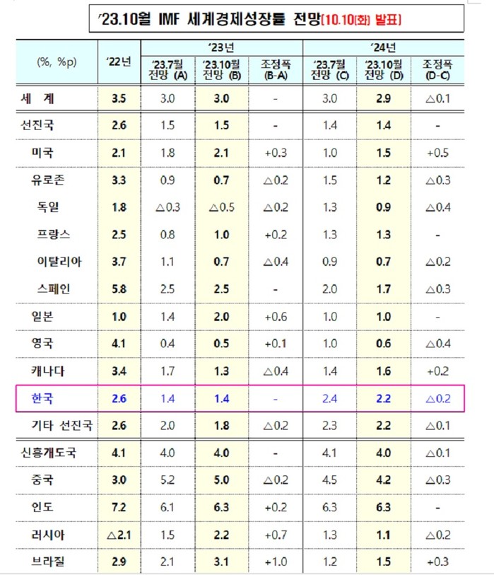 10일 기획재정부에 따르면 IMF는 이날 발표한 10월 세계경제전망을 통해 한국 경제 성장률을 7월 전망치인 1.4%로 유지했다.