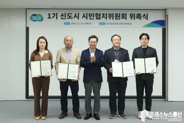 | ▲ 15일 오후 김동연 경기도청 4층 다목적회의실에서 열린 1기 신도시 시민협치위원회 위촉식에서 김동연 경기도지사가 시민위원 대표 4명에게 위촉장을 수여하고 기념촬영을 하고 있다.(사진=경기도) |