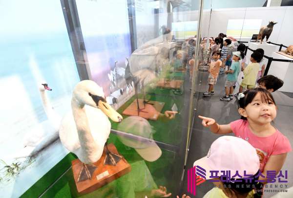 배곧아트큐브 서울대 시흥캠퍼스에서 열리는 ‘이 땅의 자연유산 천연기념물 특별전’을 찾은 어린이들은 생동감 넘치는 천연기념물을 신기하게 바라보며 선생님의 설명에 귀를 기울였다.