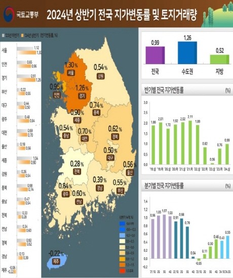 | ▲2024년 상반기 전국 지가변동률 및 토지거래량.(제공=국토교통부) |