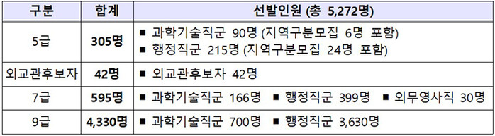 [프레스뉴스] 류현주 기자= 2025년도 국가공무원 공채시험 선발인원은 5272명으로, 직급별 선발인원은 5급 공채 305명, 외교관후보자 42명, 7급 공채 595명, 9급 공채 4330명을 확정했다.