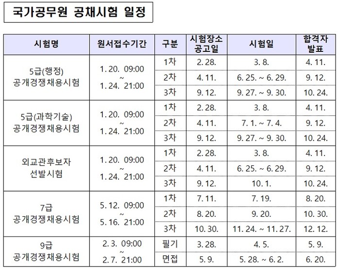 한편 올해 국가공무원 공채 필기시험은 5급 및 외교관후보자 선발시험은 3월 8일, 9급은 4월 5일, 7급은 7월 19일에 각각 치르는데 다만 시험관리 사정 등에 따라 시험 일시, 장소 등이 변경될 수 있다.
