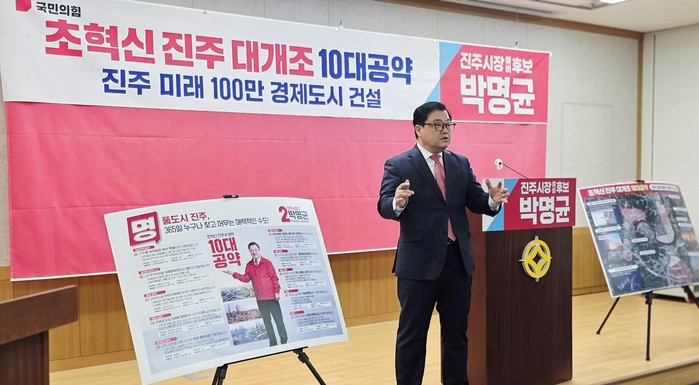 | ▲박명균 진주시장 예비후보(전 경남도 행정부지사)는 18일 진주시청 브리핑룸에서 기자회견을 열고 침체된 지역 경제를 살리기 위한 ‘진주대개조 10대 프로젝트’를 전격 발표했다. |