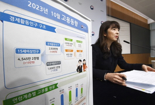 | ▲서운주 통계청 사회통계국장이 15일 오전 정부세종청사 중앙동에서 2023년 10월 고용동향을 발표하고 있다.(사진= 뉴스1) |