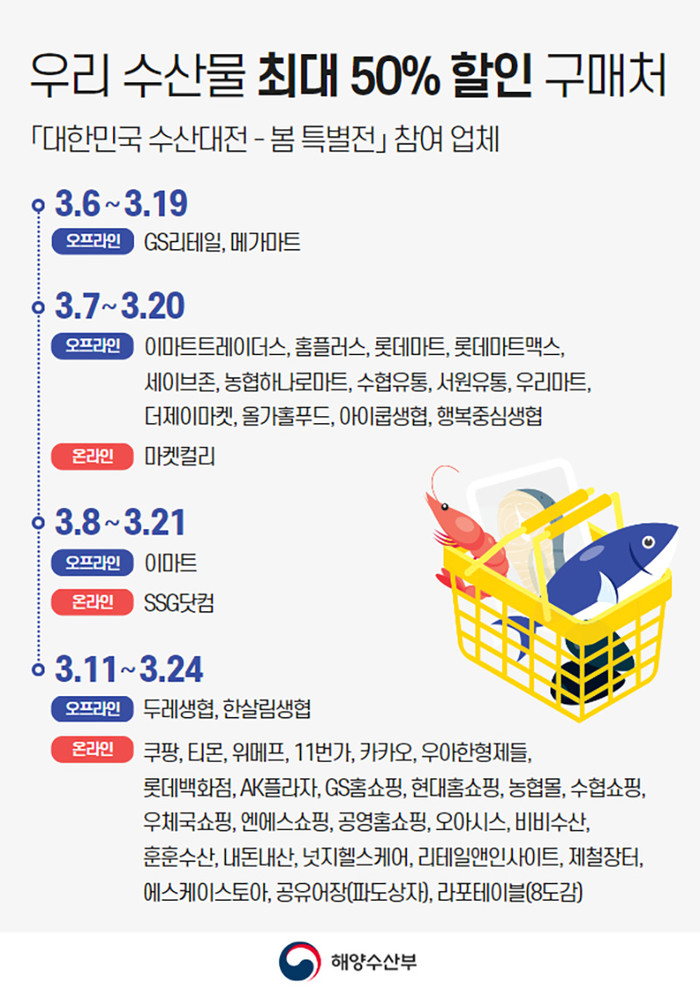 | ▲수산물 최대 50% 할인 구매처. (인포그래픽=해양수산부) |