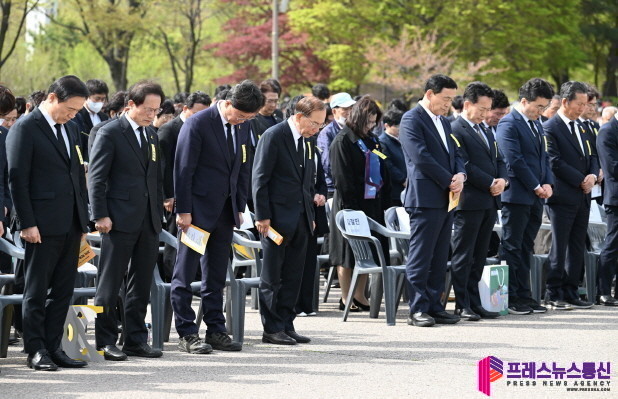 | ▲ 이민근 안산시장이 16일 오후 안산 화랑유원지에서 열린 세월호 참사 9주기 기억식에서 조승환 해양수산부장관, 염태영 경기도 부지사, 임태희 경기도교육감, 김광준 4.16재단 이사장, 김종기 4.16세월호참사가족협의회 운영위원장, 김기현 국민의힘 대표, 이재명 더불어민주당 대표, 김철민 국회의원, 고영인 국회의원, 김남국 국회의원 등 참석자들이 304명 희생자에 대한 묵념을 하고 있다.(사진=안산시) |