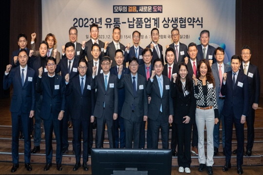 | ▲15일 서울 중구 은행회관에서 열린 2023년 유통-납품업계 상생협약식에서 조홍선 공정거래위원회 부위원장을 비롯한 유통·납품업체 대표들이 기념 촬영을 하고 있다.(사진= 뉴스1) |