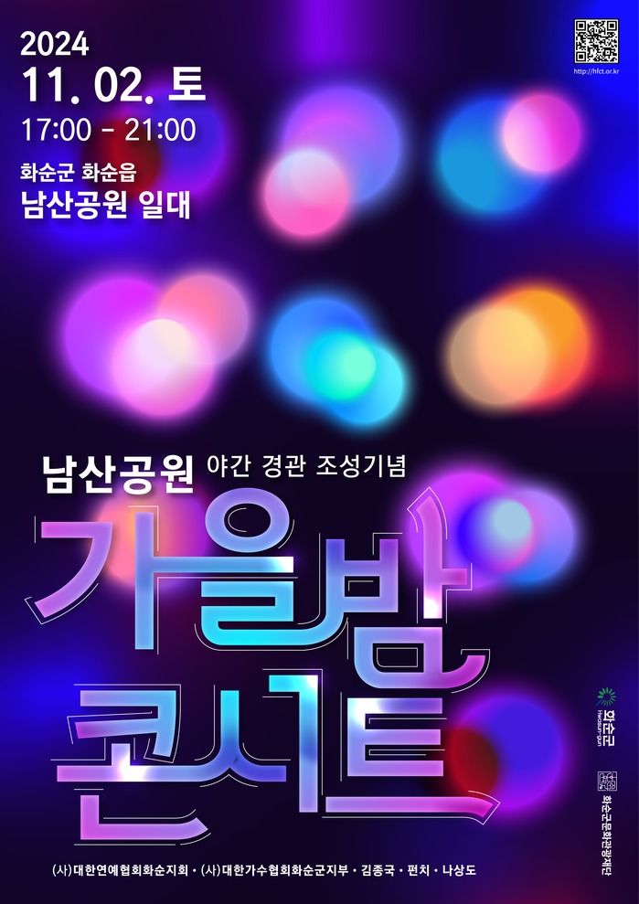 이를 기념하여 화순군민들에게 새로운 화순의 랜드마크로 탄생한 남산공원을 알리고자 오는 11월 2일 남산공원 야간경관 조성기념 가을밤 콘서트를 진행한다.