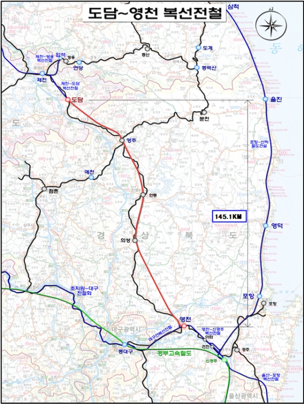 한편, 도담∼영천 철도건설 사업은 경북내륙지역의 철도서비스 향상과 남부방향 내륙지역을 통과하는 일괄 수송체계를 구축하기 위해 총사업비 4조1046억 원을 투입해 내년 완공 예정으로 추진중이다.