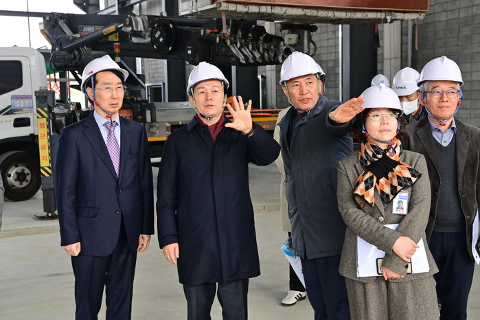 | ▲진주시는 3월 5일 조규일 진주시장과 김정환 경남테크노파크 원장이 이반성면 가산일반산업단지 내 ‘미래항공기체(AAV) 실증센터’ 공사 현장을 방문해 공정 추진 현황과 안전관리 실태를 점검했다고 6일 밝혔다. (사진=진주시) |