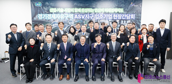 | ▲11일 오후 안산 사이언스밸리지구에서 진행된 경기경제자유구역 ASV지구 입주기업 현장간담회에서 김동연 경기도지사, 이민근 안산시장, 이기형 한양대 에리카 부총장, 김동규, 김태희 경기도의원 및 유관기관, 입주기업 관계자들이 기념촬영을 하고 있다,(사진=경기도) |