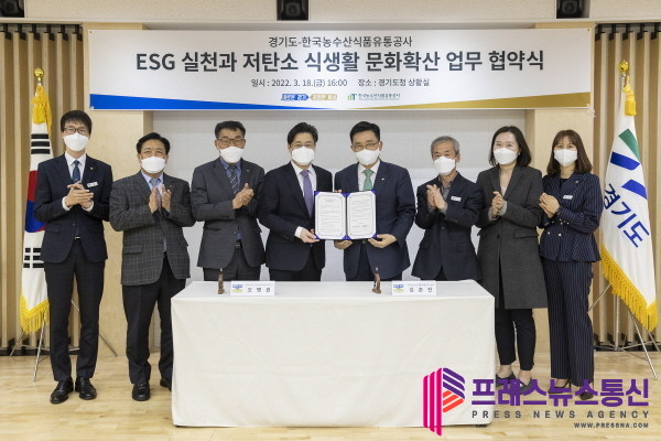 오병권 경기도지사 권한대행과 김춘진 한국농수산식품유통공사(aT) 사장은 18일 경기도청에서 환경.사회.지배구조(ESG) 실천과 저탄소 식생활 확산 및 지역경제 활성화를 위한 업무협약을 체결했다.