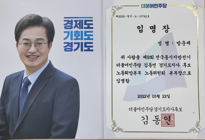 ▲ 방운제 의장이 22일 김동연 더불어민주당 경기도지사 후보로부터 노동희망본부 노동위원회 본부장의 임명장을 받았다. (사진= 김동연 동행캠프) |