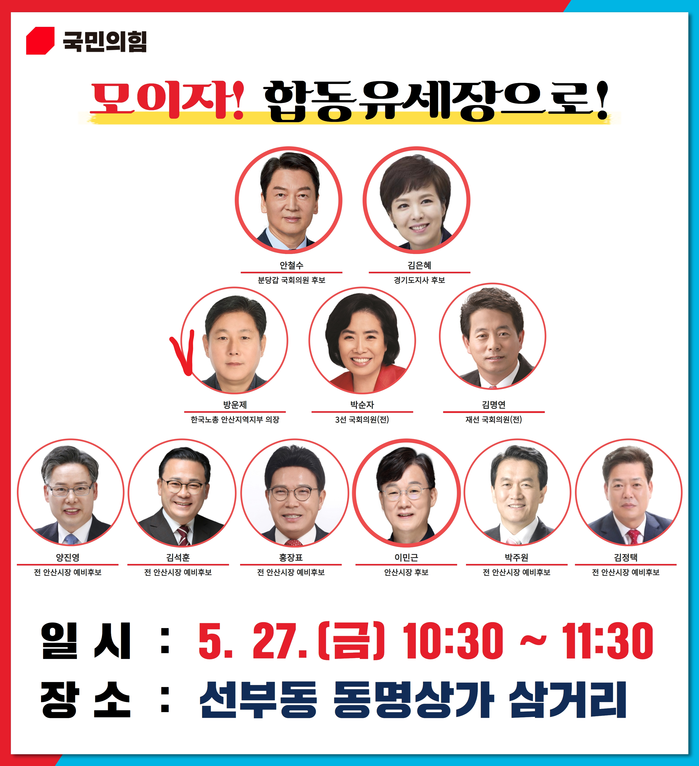 이런 방 의장이 여야를 넘나들며 5월 25일(수)에는 국민의힘 이민근 안산시장 후보를 지지 한다는 합동 유세 포스터에 버젓이 이름을 올리고(사진), 5월 27일 선부동 동명상가 삼거리 유세에는 국민의힘 안철수, 김은혜, 박순자, 김명연, 박주원, 홍장표 등 여권관계자가 총 출동한 합동유세장 포스터에 보란듯이 사진(사진)을 올리는 등 일관되지 않은 행보를 보여 눈총을 사고 있다.