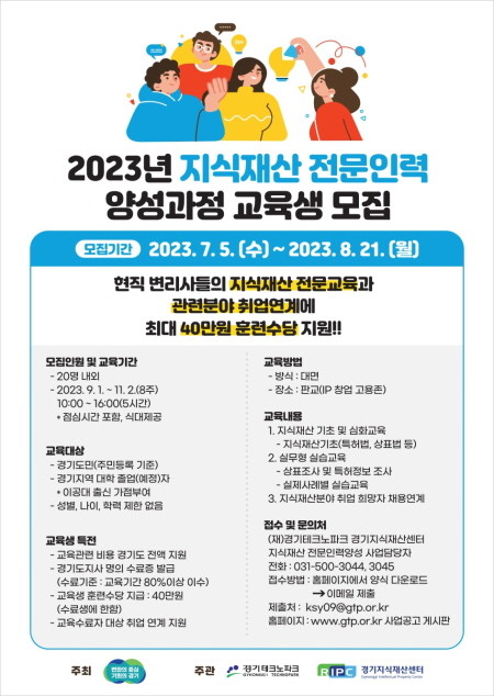 | ▲ 2023년 지식재산 전문인력 양성과정 교육생 모집 포스터(사진=경기테크노파크) |