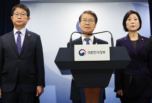 | ▲이정식 고용노동부 장관이 24일 정부서울청사에서 중대재해처벌법 추가 적용유예 개정안 입법 촉구 합동 브리핑을 하고 있다. 왼쪽부터 박상우 국토교통부 장관, 이정식 고용노동부 장관, 오영주 중소벤처기업부 장관 (사진= 뉴스1) |