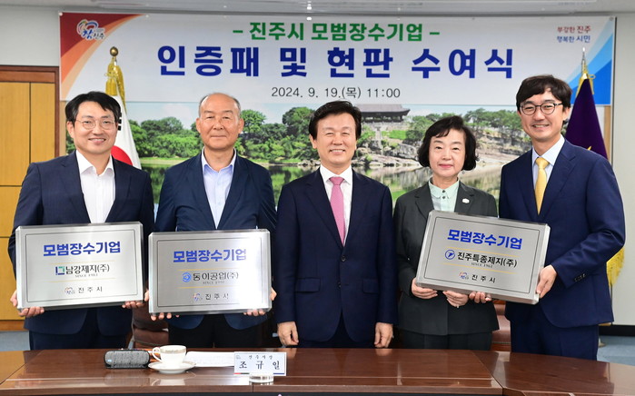인증패와 현판을 전달한 조규일 시장은 “지역의 장수기업이 지역경제에 기여한 바가 매우 크다”며 “진주시 모범장수기업의 자부심을 가지고, LG, GS, 삼성, 효성이 태동한 진주의 K-기업가정신을 이어받아 기업의 사회적 책임과 지속가능한 성장에 더욱 힘써 줄 것”을 당부했다.