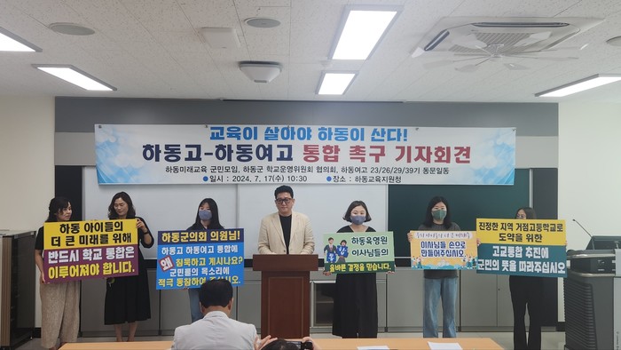 이날 기자회견에 참석한 하동초등학교 학부모회장은 “교육청에서 실시한 학부모 설문조사에서 참여 학부모 68%가 통합을 찬성했는데 이러한 뜻을 외면하는 사실이 너무 안타깝다”며, “통합 없이 이대로 간다면 5년 후, 10년 후 하동고와 하동여고는 전교생 100명, 50명도 채 되지 않는 소규모 학교로 전락할 것이고 그렇게 되면 좀 더 나은 고등학교를 위해 타지로 나가는 경우가 지금보다 훨씬 더 늘어날 것”이라고 우려를 표했다.