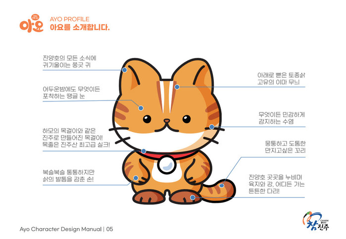 진주 삵 ‘아요’는 장난꾸러기지만 긍정적이며, 영리하고 활동적인 성격을 가졌다. 특히, 지역 특산물 가운데 하나인 진주 땡초를 좋아한다는 설정도 더해졌다.