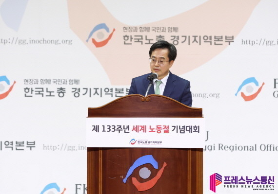 | ▲ 28일 오전 경기종합노동복지회관에서 열린 제133주년 노동절 기념행사에서 김동연 경기도지사가 축사를 하고 있다.(사진=경기도) |