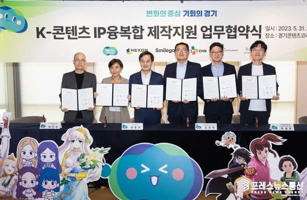 김동연 경기도지사는 31일 경기콘텐츠코리아 랩(성남 판교 경기창조경제혁신센터 7층)에서 ‘K-콘텐츠 지식재산권(IP) 융복합 제작 지원’ 사업의 하나로 카카오엔터테인먼트, SM엔터테인먼트, 넥슨, 스마일게이트, CJ ENM 등 지식재산권(IP) 보유기업 5개 사와 협약을 체결했다.