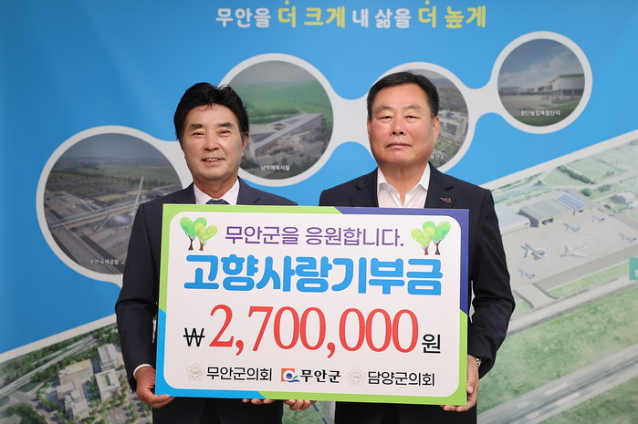 무안군의회는 지난 5일 담양군의회와 고향사랑기부제의 성공적 안착과 지역 상생 발전을 위해 상호 기부를 추진했으며, 이날 양 기관의 의원과 직원 27명씩 총 54명이 동참해 양 지자체에 270만 원씩 기부하며 고향 사랑의 마음을 전했다.