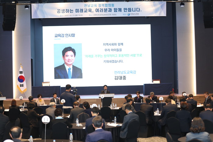 [전남=프레스뉴스] 강래성 기자= 전라남도교육청(교육감 김대중)이 3월 21일(화) 신안 라마다프라자호텔에서 2023년 3월 전남교육 정책협의회를 갖고 지역과 연계한 ‘공생의 미래교육’ 실현을 위한 정책 의지를 다졌다.